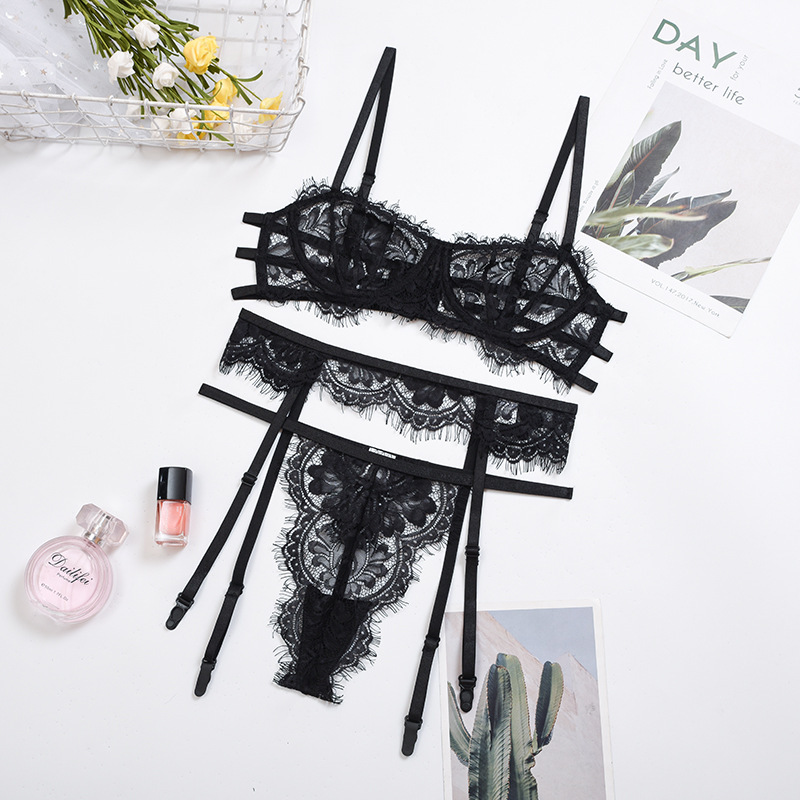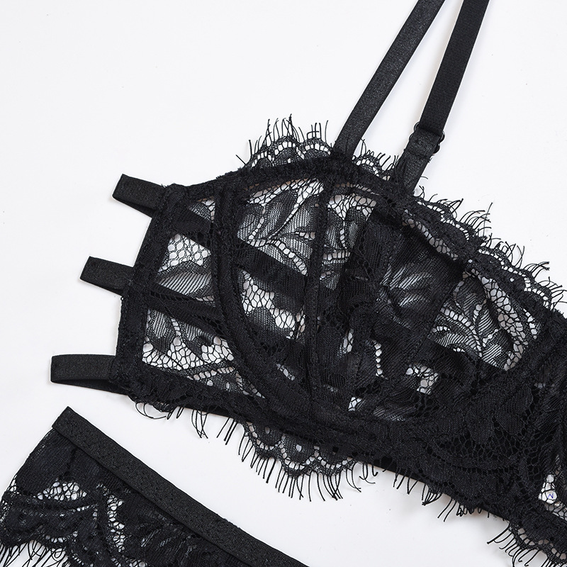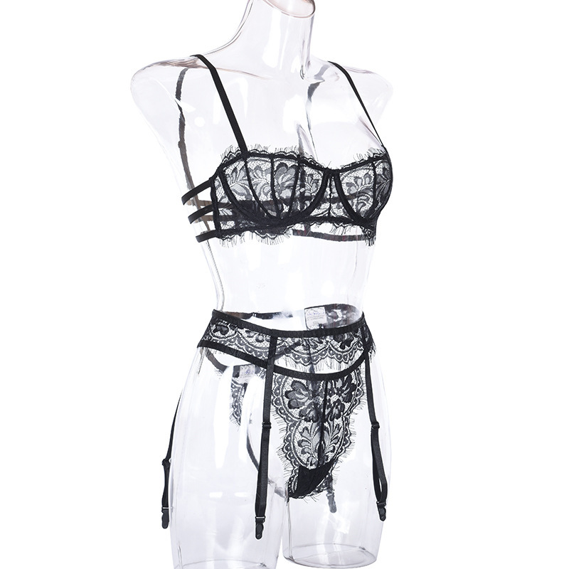 Sexy Lingerie Set: Features a three-piece design with hollow and strap details for a seductive look.