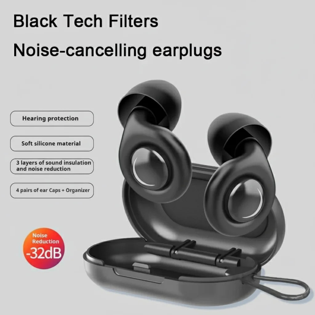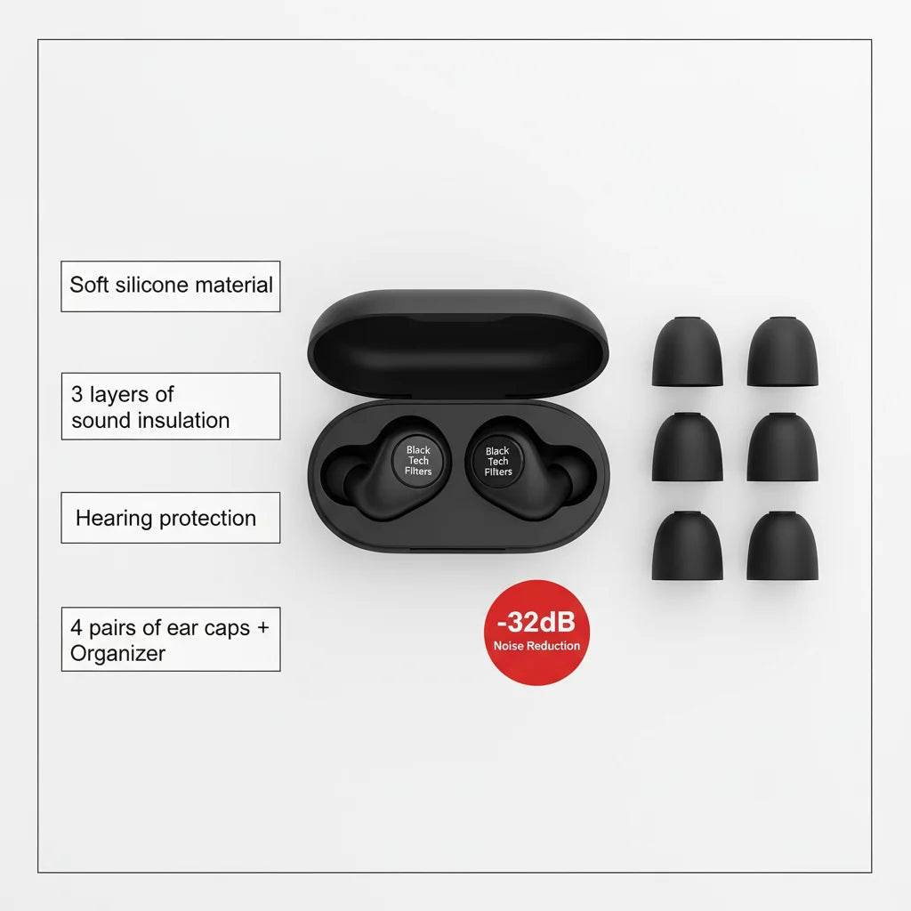 Experience true silence with our Silicone Ear Plugs. Featuring advanced Black Tech Filters and 3-layer sound insulation, they deliver a powerful -32dB noise reduction, letting you enjoy pure quiet.